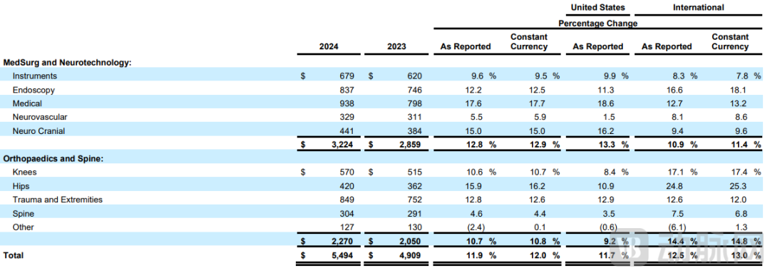 史赛克医学外科和神经技术部门第三季度的净销售额达到32.2亿美元,同比增长12.8%。这部分增长主要来自市场需求增加,尤其是国际市场需求。在全球手术量增加、患者需求上升的背景下,史赛克的内窥镜产品线实现约15%的增长,神经血管产品增长约6%,颅脊神经产品增长约8%。