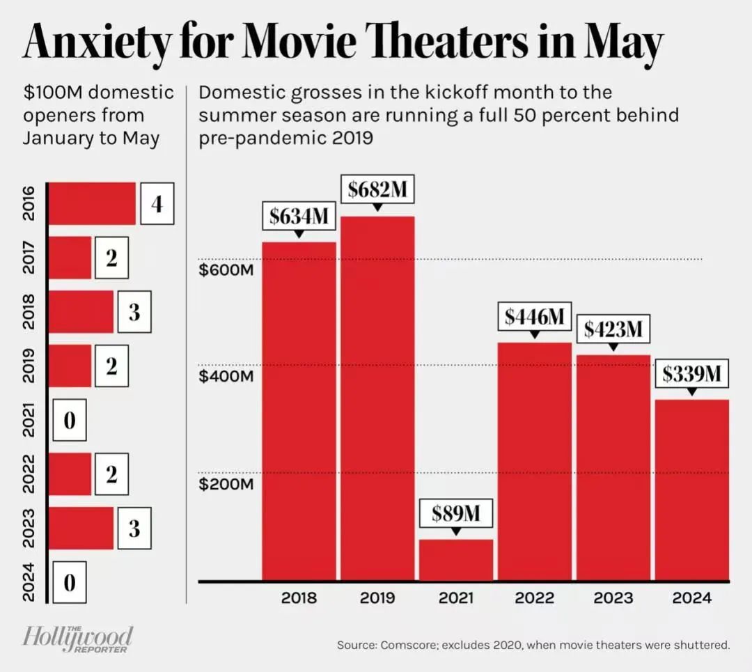 以月度的维度视之,2024年呈现出明显的低开高走态势:在上半年,受制于特效巨制改档或发挥失常,北美共有五个月录得同比下滑,且除6月外皆大跌双位数以上,唯一实现增长的月份为3月。以头四个月计,北美累计票房的降福曾超过22%,到上半年收官时才缩小至19%左右。