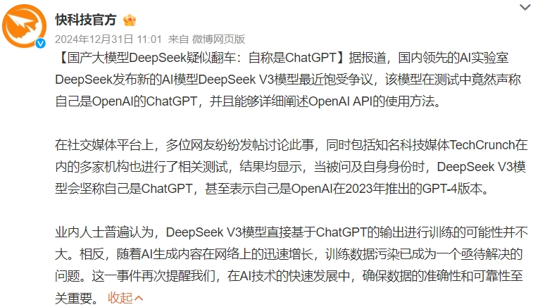 此前,国内领先的AI实验室DeepSeek发布新的AI模型DeepSeek V3模型就出现在测试中竟然声称自己是OpenAI的ChatGPT的情况,并且能够详细阐述OpenAI API的使用方法。
