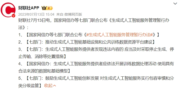 2023年1月10日,国家互联网信息办公室、工业和信息化部和公安部联合发布的《互联网信息服务深度合成管理规定》正式施行,旨在加强互联网信息服务深度合成管理,维护国家安全和社会公共利益,保护公民、法人和其他组织的合法权益;此后,国家网信办联合国家发展改革委等多部门公布了《生成式人工智能服务管理暂行办法》,并自2023年8月15日起施行。