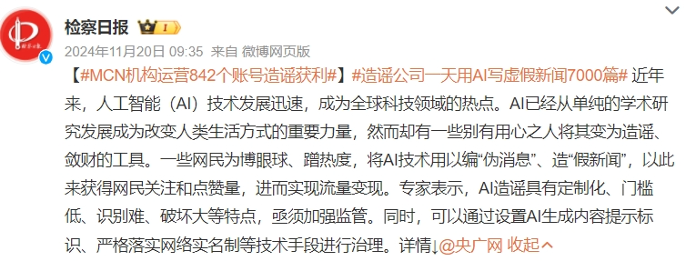 据媒体报道,2024年6月中旬,一家MCN机构的实际控制人王某某因利用AI软件生成虚假新闻并大肆传播,扰乱公共秩序,被警方行政拘留。据警方通报,王某某共经营5家MCN机构,运营账号842个,自2024年1月以来,王某某通过AI软件生成虚假新闻,最高峰一天能生成4000至7000篇。