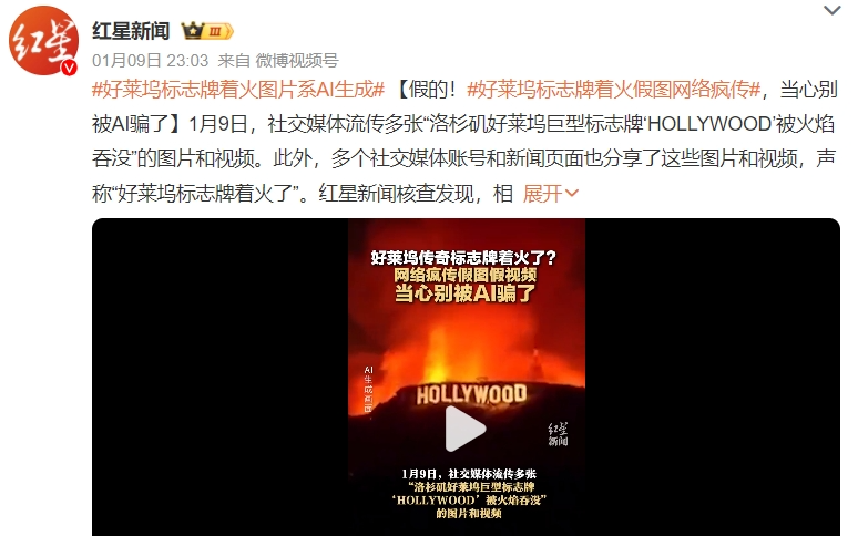 “好莱坞标志牌着火的那张图,各个影迷群几乎都传疯了,大家还调侃这是在电影市场之外,先在物理层面‘陷落’了,结果,第二天就看见媒体辟谣说这张照片是AI伪造的。”橙子表示,这张假图本身就有情绪性,和新闻报道放在一起更显得真假难辨。