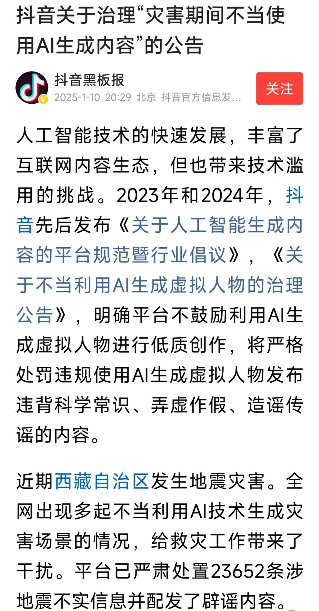 1月10日晚间,抖音官方发布公告称,平台已严肃处置23652条涉地震不实信息并配发了辟谣内容。公告中还提到,2023年和2024年,抖音就曾发布AI内容治理相关公告,明确平台不鼓励利用AI生成虚拟人物进行低质创作,将严格处罚违规使用AI生成虚拟人物发布违背科学常识、弄虚作假、造谣传谣的内容。
