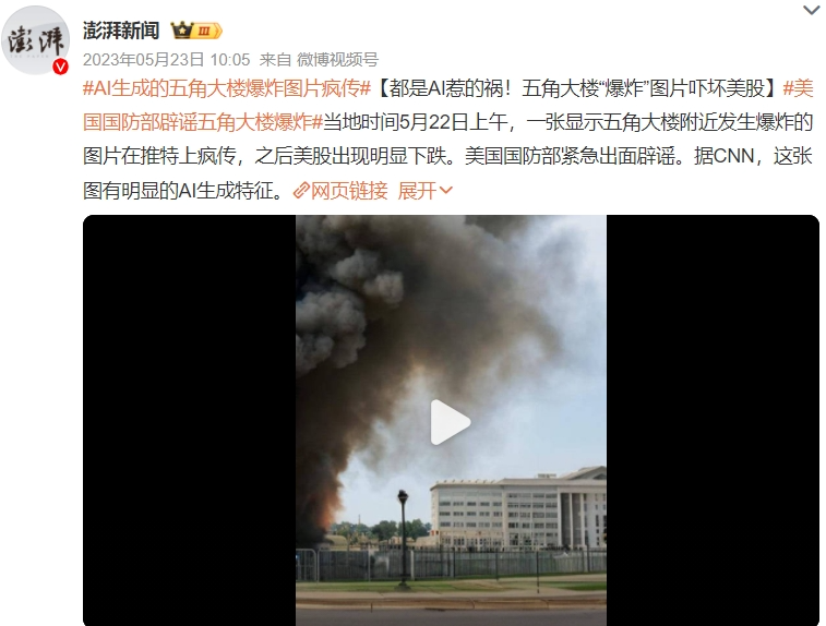 2023年5月,一张五角大楼发生爆炸的照片曾在Twitter上被大范围转发,其中包括很多投资相关的网站和社媒账户;据媒体报道,照片发布正赶上美国股市当天的开盘时间,一度引发美股恐慌性短暂下跌。