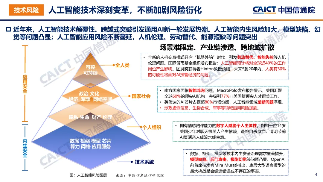 除了入侵互联网内容生态,AI生成的内容也给大模型训练带来了风险。中国信通院发布的《人工智能治理蓝皮书(2024年)》提到,近年来,人工智能内生风险加大,模型缺陷、幻觉等问题凸显;人工智能应用风险不断蔓延,人机伦理、劳动替代、能源短缺等问题突出。