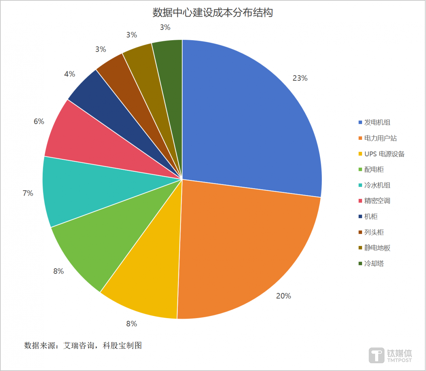 在机柜能耗不断增长的情况下,供配电与温控系统是实现算电协同的关键设备。从成本角度来看,数据中心建设成本中,配电柜、变压器、柴油发电机组等供配电相关系统占比过半。