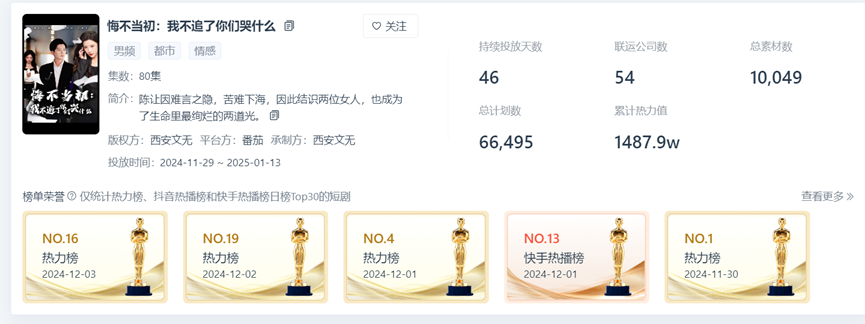 (根据ADX短剧版,《悔不当初:我不追了你们哭什么》累计热力值为 1487.9w)