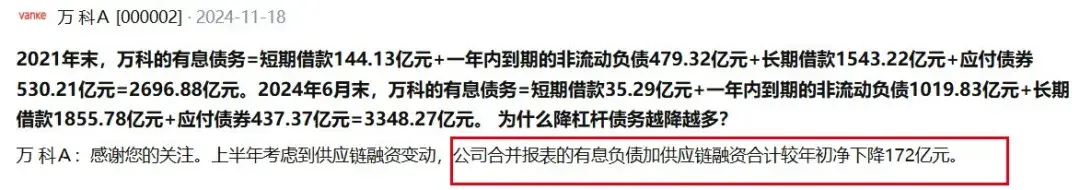 在深交所互动易上,有投资者质疑万科,“为什么债务越降(反而)越多”?2024年11月,万科回复称,“上半年考虑到供应链融资变动,公司合并报表的有息负债加供应链融资合计较年初净下降172亿元。”