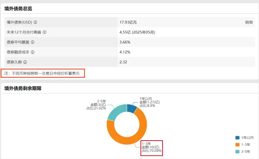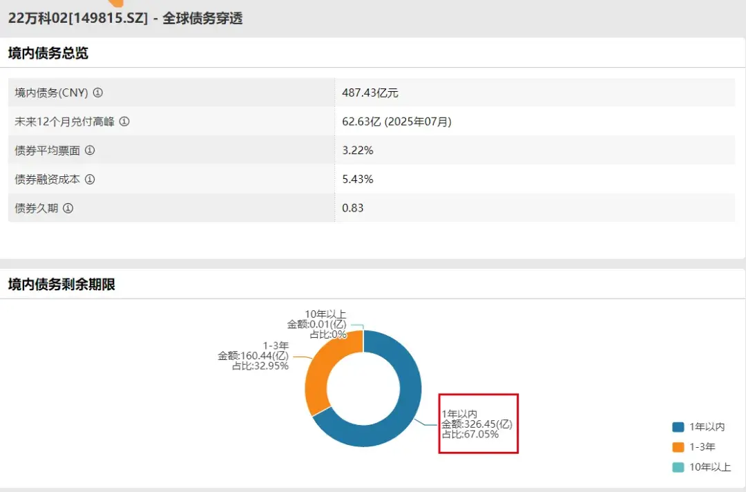 要知道,2025年是万科的一个偿债高峰年。Wind数据显示,截至2025年1月16日,万科一年内到期的境内债务326.45亿元,占比总境内债务的67.05%。此外,公司还有1.27亿美元境外债务将于一年内到期。