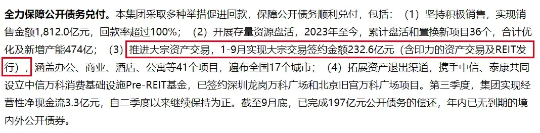 对于外界关心的偿债兑付问题,万科在2024年三季度财报中给出了具体回笼现金流的举措:坚持积极销售、开展存量资源盘活、推进大宗资产交易、拓展资产退出渠道。