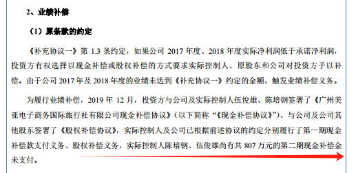 由于2017年和2018年,美亚科技的净利润低于对赌协议中的承诺净利润,因此触发了业绩补偿义务,美亚科技的实控人及公司已根据前述协议的约定分别履行了第一期现金补偿款支付义务、股权补偿义务,而实际控制人陈培钢、伍俊雄尚有共807万元的第二期现金补偿金未支付。