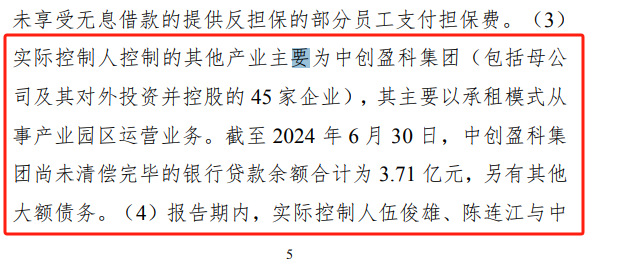 事实上,上述的资金压力仅仅只是冰上一角。在美亚科技的问询函中,北交所明确指出,美亚科技实际控制人控制的其他产业主要为中创盈科集团(包括母公司及其对外投资并控股的45家企业),其主要以承租模式从事产业园区运营业务。截至2024年6月30日,中创盈科集团尚未清偿完毕的银行贷款余额合计为3.71亿元,另有其他大额债务。