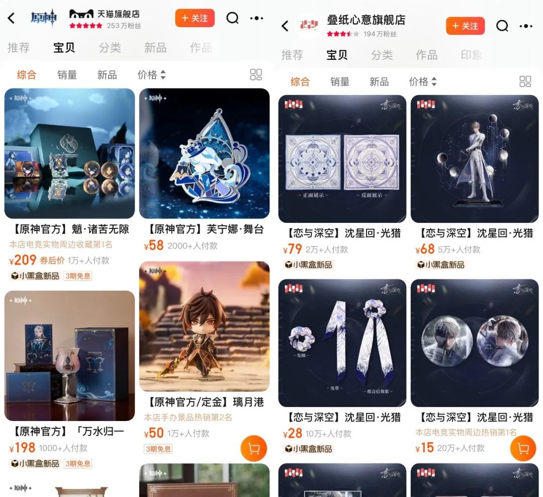 彼时,头部游戏衍生品销量还并未真正爆发,但数额已颇为惊人。以《恋与制作人》官周为例,2023年时,“叠纸心意”孵化的游戏衍生品每一季新款销售额在百万量级。顶流《原神》的官方旗舰店,2022年年流水大约在1.5亿水位。