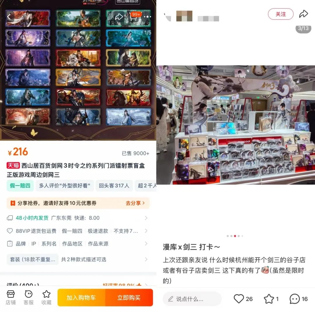 典型例如网游厂商西山居,今年便显著加快了对于《剑网3》的游戏周边开发频次,在线上商城之外,上线大量线下谷店,此举也被行业视为增进粉丝粘性,延长这一15年老游戏生命力的举措。