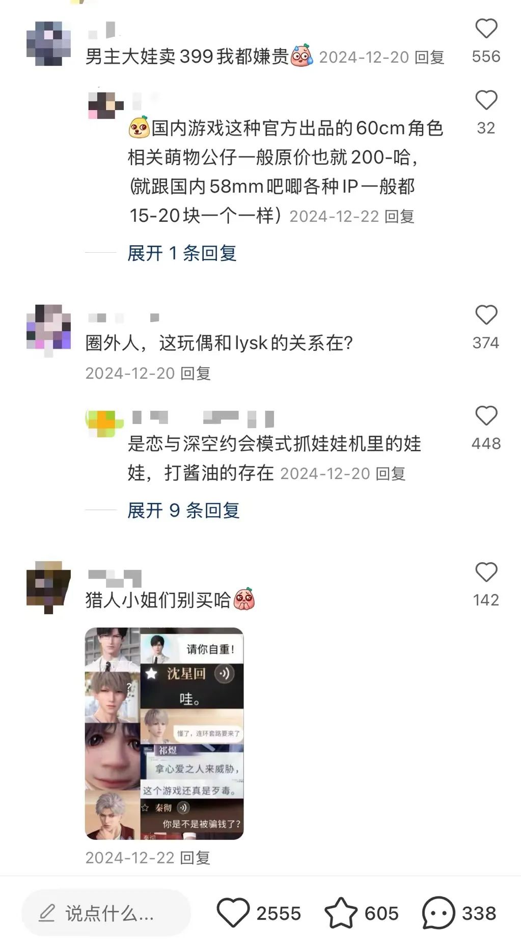 同样,此前《恋与深空》与名创优品的官方联名产品也曾因为高价陷入极大争议,定价为159元、179元和399元的三种毛绒玩偶外观为娃娃机中的娃娃,与游戏中男主角存在关联但并非形象玩偶,角色属性较弱。因此,遭遇大量玩家不满,也被拿来和名创中大量Q版毛绒玩偶价格进行对比。