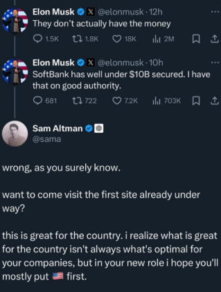 质疑声立刻就响起,在该消息宣布之后,马斯克在X上泼冷水,称“他们实际上没有钱”。奥特曼直接回复该条消息回怼:“(你的说法)是错误的,你心里很清楚。”