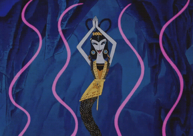 值得一提的是,《葫芦兄弟》系列是剪纸动画,为刻画蛇精的媚态和狠毒,她的说话表情、行走姿态都经过了精心设计。创作团队把蛇的特性融到人物中,在设计蛇精近景说话时,扭腰媚态的间隙加入了吐蛇信子的动作,画龙点睛刻画出反派角色蛇精的阴险毒辣。此外,妖洞里还栖息着许多蛇子蛇孙,有的蛇会吐火,有的的蛇懂得喷迷魂雾扰人心智,可谓集刻板印象反派之大成。