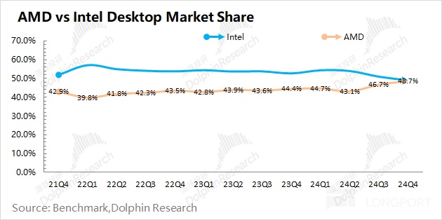 AMD 在桌面级和笔电市场的份额都在提升,其中虽然英特尔仍在笔电市场处于领先位置,但 AMD 本季度在桌面级市场的份额已经赶上英特尔,有望进一步实现反超。