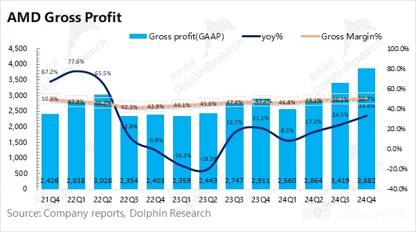 AMD 在 2024 年第四季度实现毛利 38.82 亿美元,同比增加 33.4%。毛利的增速超过收入端,主要是因为毛利率也在提升。