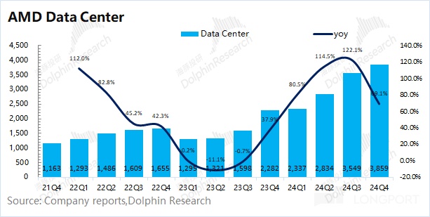 AMD 的数据中心业务在 2024 年第四季度实现收入 38.59 亿美元,同比上升 69.1%,低于市场预期(40.9 亿美元)。本季度的增长,这得益于 AMD Instinct GPU 以及第四代和第五代 AMD EPYC CPU 销售的拉动。