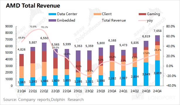AMD 在 2024 年第四季度实现营收 76.58 亿美元,同比增长 24.2%,基本符合市场预期(75.3 亿美元)。虽然公司本季度的游戏业务和嵌入式业务仍有下滑,但公司的数据中心业务和客户端业务的增长表现带动了公司整体营收端的提升。