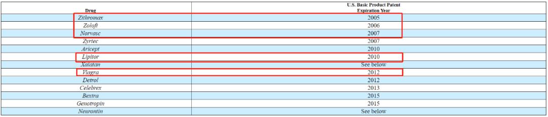 图:辉瑞2004年核心产品专利到期时间,来源:公司财报