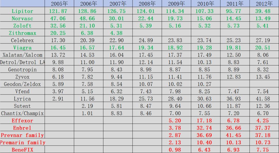 图:2005年—2012年辉瑞核心产品一览,来源:锦缎研究院