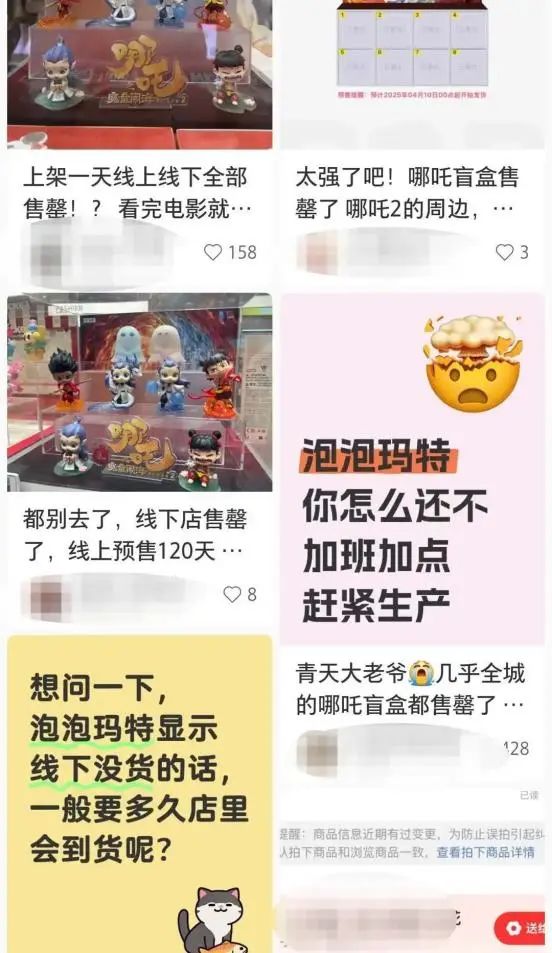 随着影片成为今年春节档的爆款,“谷子经济”(二次元文化周边经济)快速发展,《哪吒2》的周边产品市场火爆异常,盲盒、手办等衍生品供不应求,尤其是泡泡玛特联名款盲盒,更是一度卖到脱销。