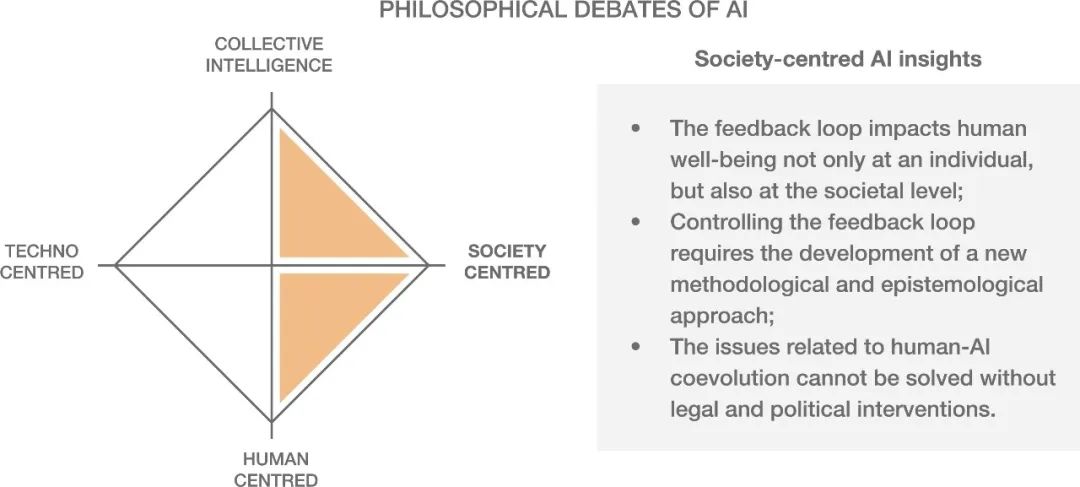 以社会为中心的人工智能为人工智能社会影响的辩论带来了三个额外的元素(见图3),分别是(i)反馈循环不仅影响个人福祉,也影响社会福祉;(ii)管理反馈循环需要发展新的科学方法;(iii)与人类-人工智能协同进化相关的问题,没有法律和政治干预是无法解决的。