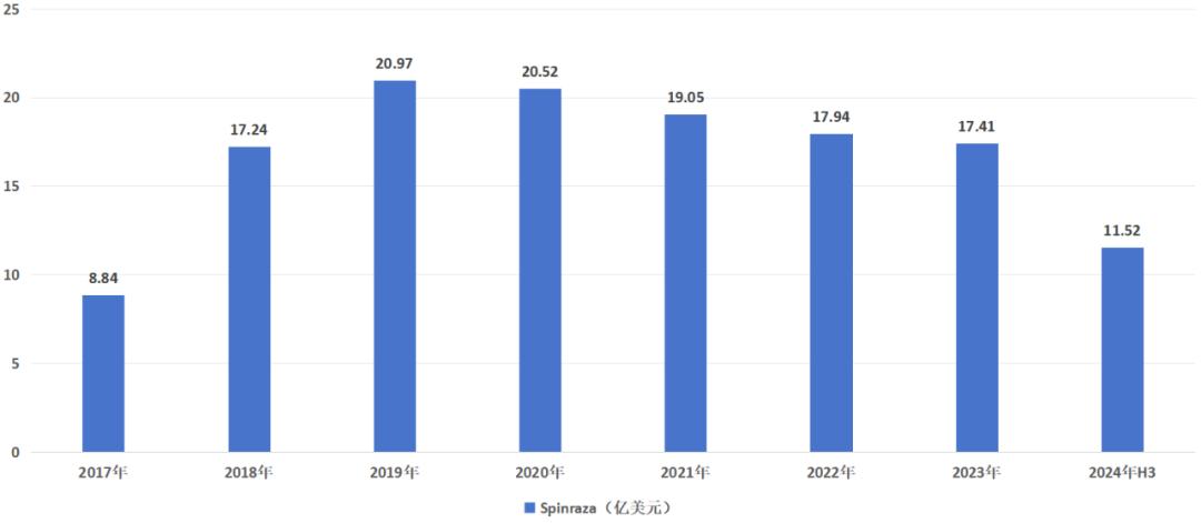 作为首款SMA的精准靶向治疗药物,Spinraza上市定价高达12.5万美元/瓶。上市首年,Spinraza销售额就高达8.84亿美元,并在2021年达到销售峰值24.06亿美元。2024年前三季度,Spinraza营收虽有下滑,但依然能够贡献11.52亿美元的营收。