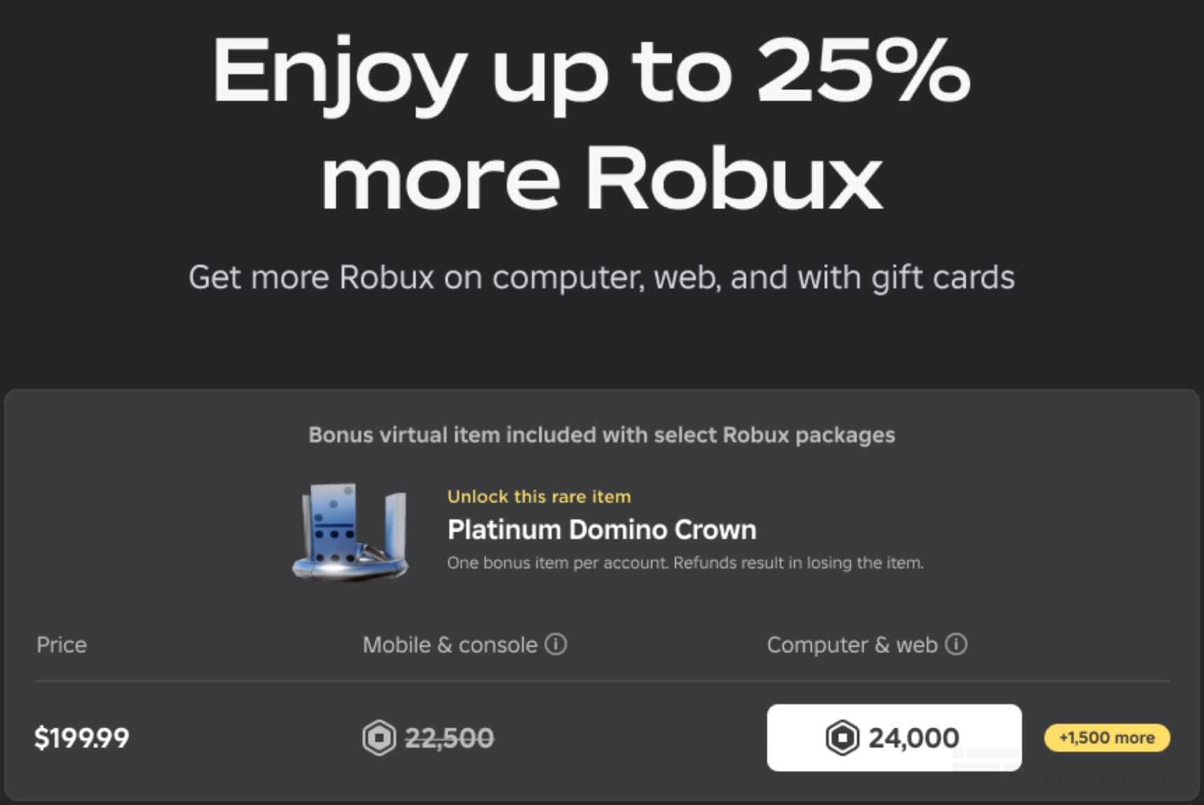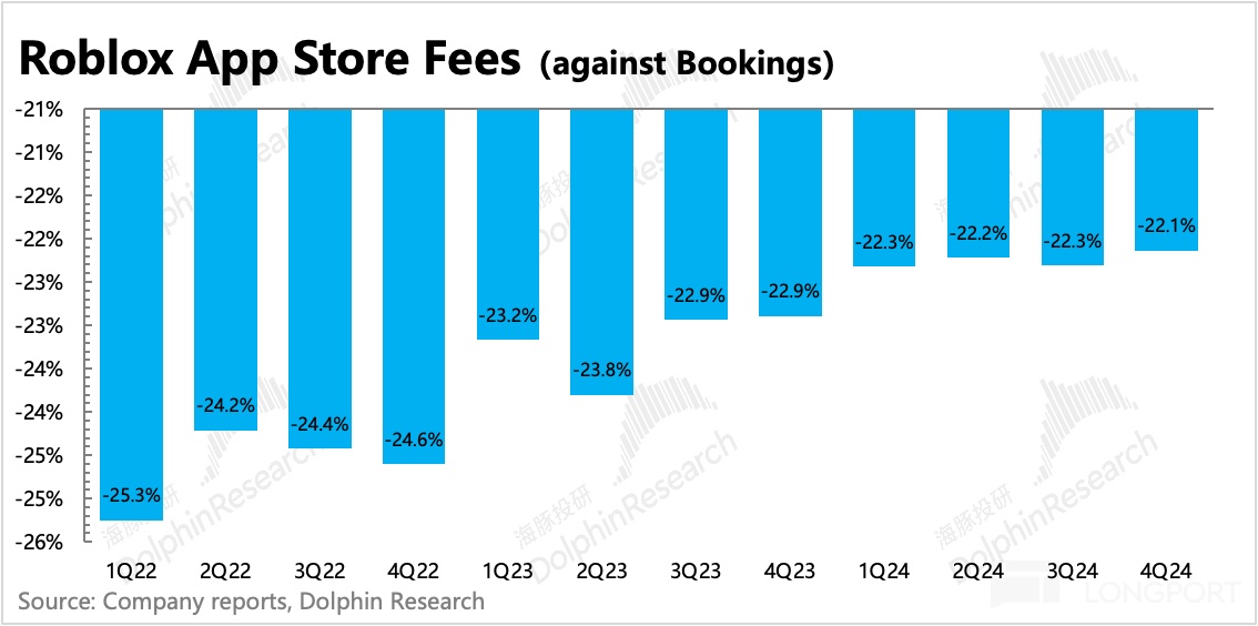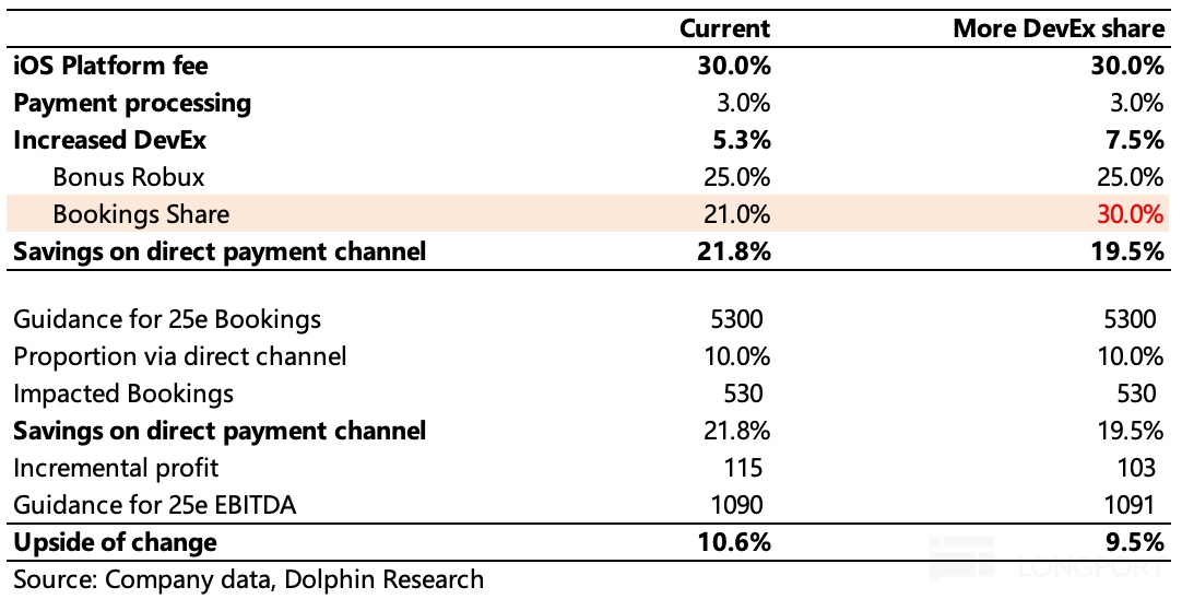 除此之外,今年年初,Roblox 开始引导用户通过官网 web 进行充值,并给予更多的 Robux 币激励,从而绕开移动端的 “苹果税”、“谷歌税”。海豚君简单计算,流水中每 10% 绕过苹果税,那么对终端 EBITDA 的影响也会增加约 10%,这个空间可以让渡更多的流水分成给到开发者。