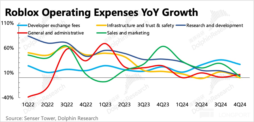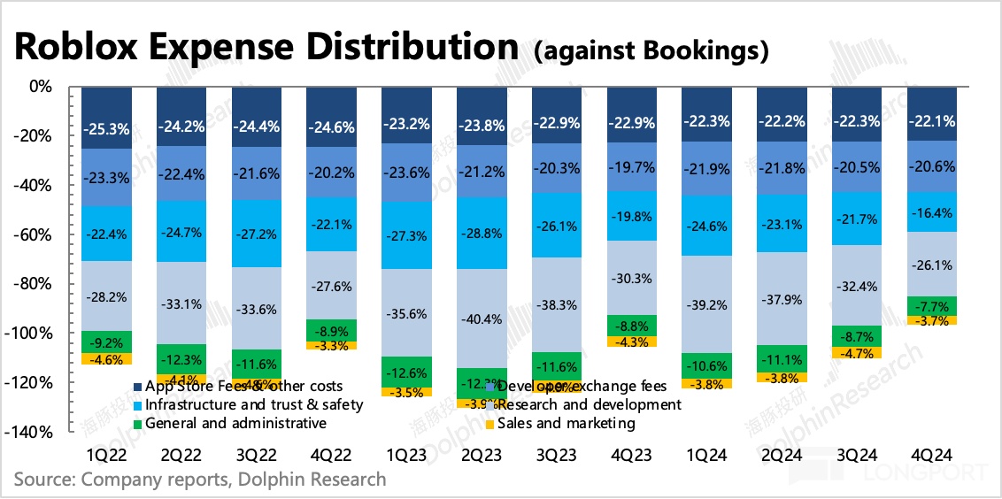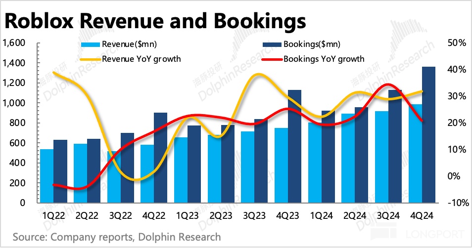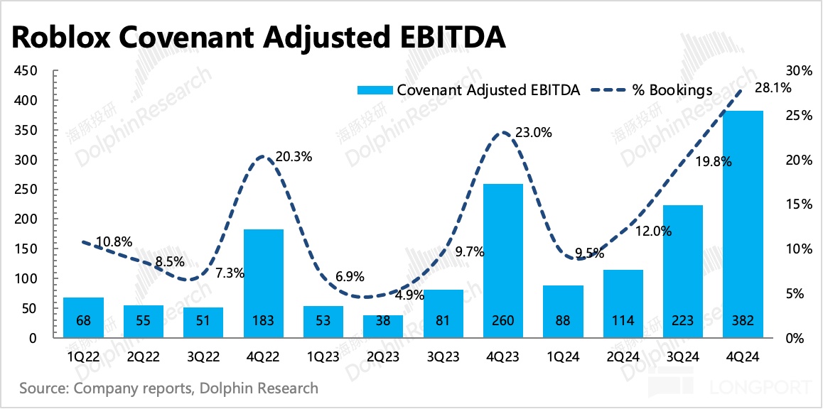 而回到短期上,DAU 和 Bookings 也已经从年底重新回升。四季度展现出的,忠实用户的粘性仍在增加,人均变现效率在提升,更重要的是 Roblox 的经营效率和规模效应已经通过过去一年的表现向市场展现出来。再加上引导用户绕道苹果税的操作,在获得更高毛利率的同时,也顺势提高了开发者获得的分成收入,有望激励开发者生产更多的优质游戏,丰富平台生态。
