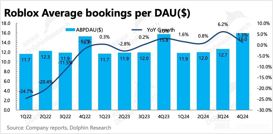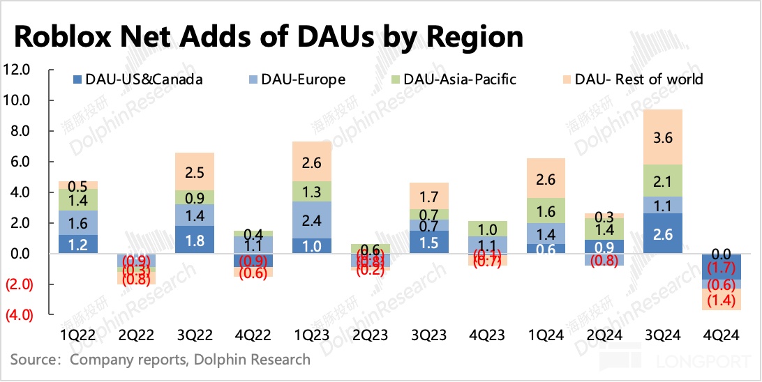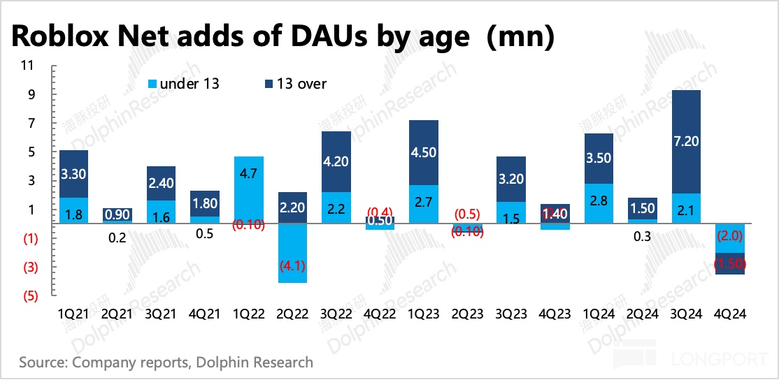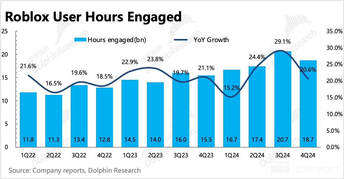 四季度 DAU 和用户总时长均不及预期,季节性波动也显著大于去年,从而引发市场对 Roblox 生态扩张持续性的担忧。
