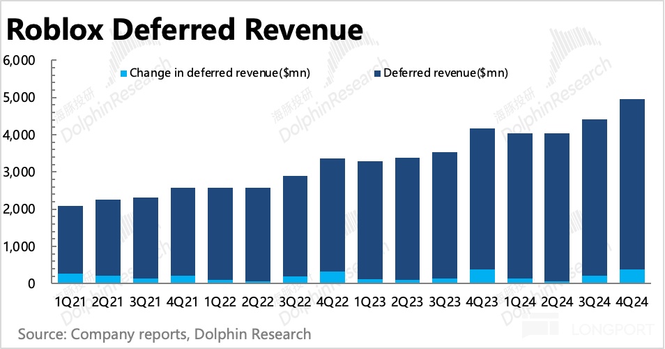 对于 Roblox 这种订阅流水前置,经营支出中占比较大(对比 Bookings,一般为 20~21%)的开发者分成支出滞后的优秀商业模式,正常经营周期下,只要盯着 Bookings 就好,最多再根据递延收入看看未来短期趋势。