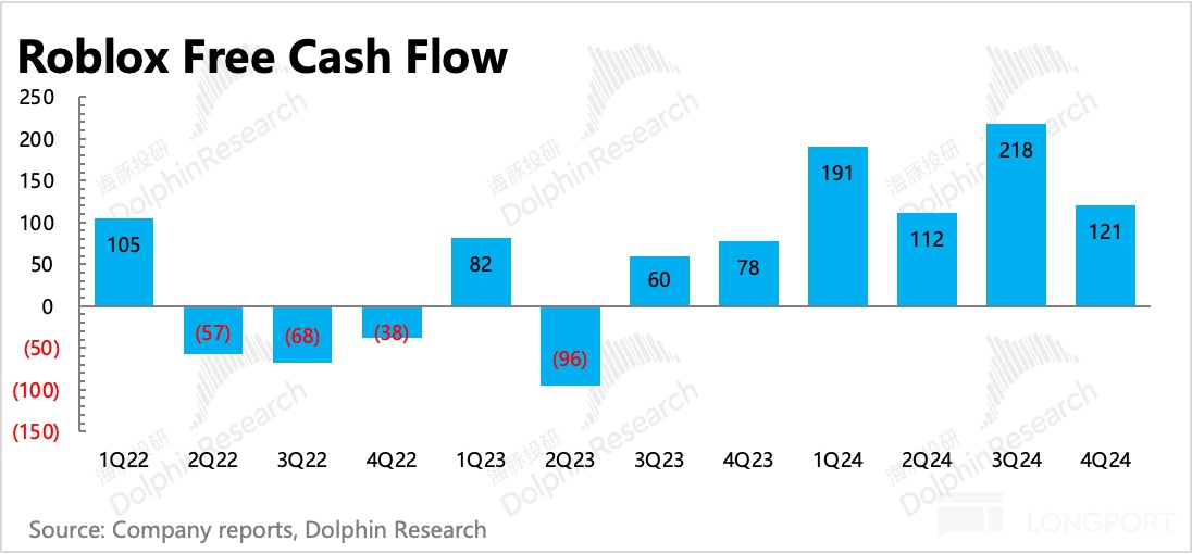 关于 Q1 以及 2025 年的利润目标,管理层仍然维持同比提升 100~300 基点的改善节奏,但电话会中透露并未将降本的考虑包含其中。因此这里的改善空间有望超出指引,除了费用端继续严控外(但人员成本会有个位数增速的增长),还会出现成本端的优化——今年年初,Roblox 开始引导用户通过官网 web 进行充值,并给予更多的 Robux 币激励,从而绕开移动端的 “苹果税”、“谷歌税”。
