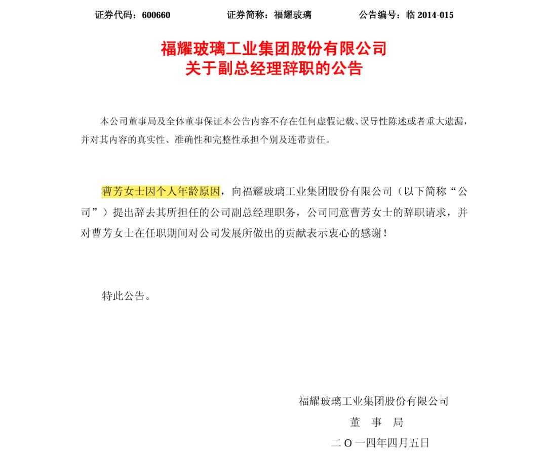 有意思的是,在曹芳于2014年卸任福耀玻璃副总经理一职时,彼时福耀玻璃发公告给出的解释是,“曹芳女士因个人年龄原因”。