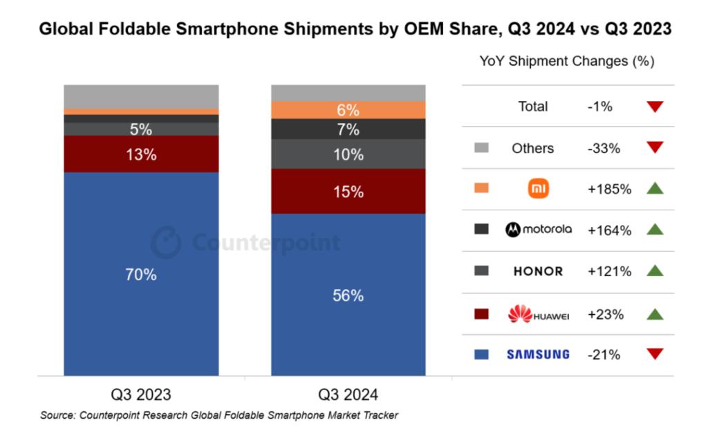Counterpoint Research公布的全球折叠屏智能手机市场追踪报告显示,在经历了连续六个季度的同比增长态势后,2024年第三季度全球折叠屏手机市场出货量同比下跌1%(第四季度和全年数据未出)。这是该市场历史上首次在第三季度出现下滑,与一、二季度平均48.5%的出货量同比增幅形成鲜明对比。