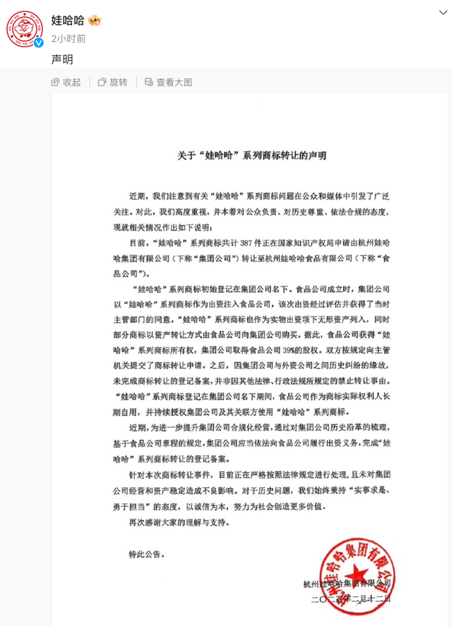 2月12日中午,杭州娃哈哈集团有限公司(简称“娃哈哈集团”)在官方微博发布关于“娃哈哈”系列商标转让的说明。