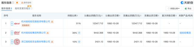 侃见财经通过天眼查App发现,杭州娃哈哈食品有限公司的控股股东为杭州娃哈哈宏振投资有限公司,持股比例为51%,另外两位股东分别为杭州娃哈哈集团、浙江娃哈哈实业股份有限公司,持股比例分别为39%、10%。