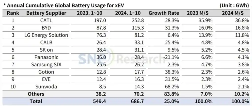 宁德时代动力电池跑赢了全球和中国新能源车增速的大盘,市占率依然领先。韩国机构SNE Research发布的数据显示,2024年前10个月,宁德时代在全球动力电池市场的份额为36.8%,排名第一,领先第二名比亚迪20个百分点。