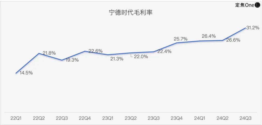 它的赚钱能力明显高于同行。2024年Q3,宁德时代的毛利率达到31%,亿纬锂能、国轩高科、欣旺达分别为19%、18%、15%。