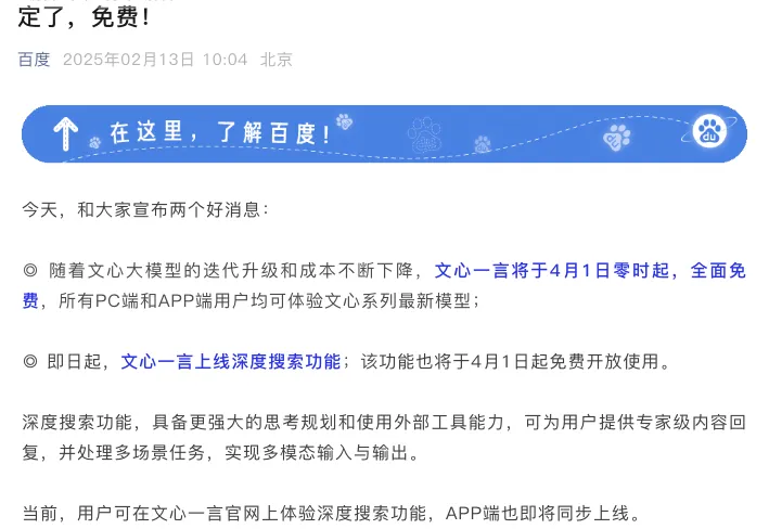 更有甚者,DeepSeek 还引发了巨头们的商业护城河崩坏。2月13日,百度官宣,文心一言将于4月1日零时起全面免费,所有PC端和App 端用户均可体验文心系列最新模型。无独有偶,OpenAI CEO萨姆·奥尔特曼也在社交媒体平台透露,未来ChatGPT免费用户将可以在标准智能水平下无限制访问GPT-5。