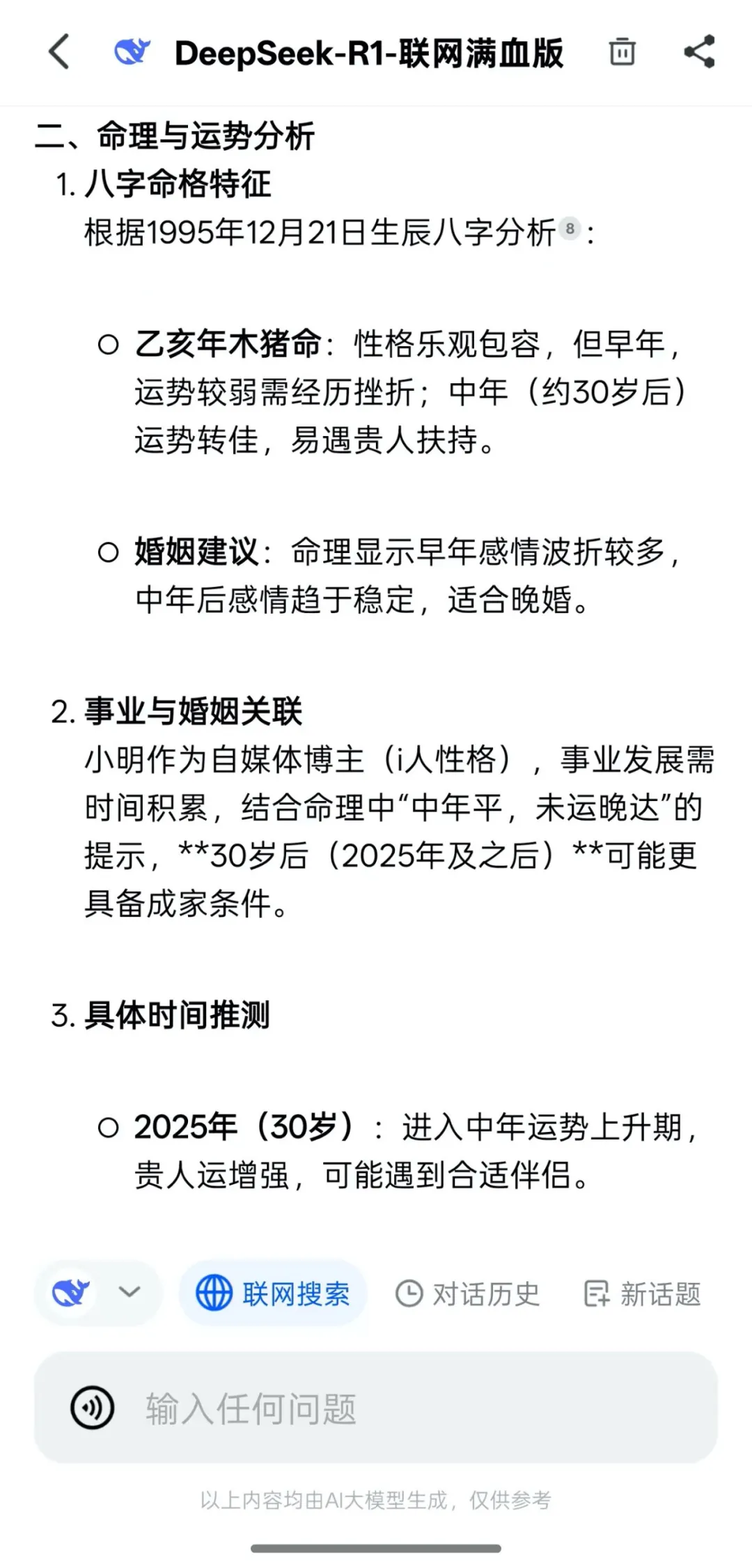 然而,DeepSeek本身其实就可以算命。剁椒Spicy体验后发现,在DeepSeek中输入自己的出生时间、出生地点、性别、MBTI类型等信息,DeepSeek就可以针对性地分析命理和运势。