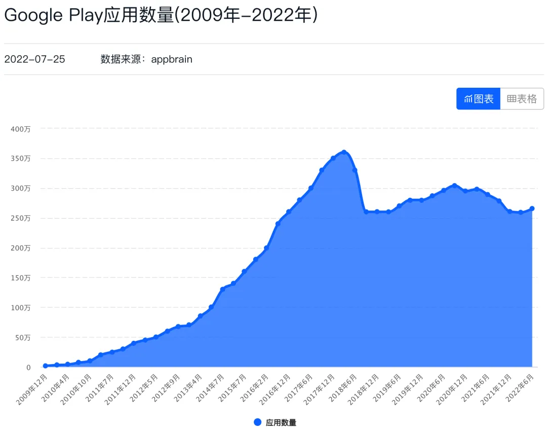 然而需要注意的是,安卓之所以问鼎江湖,不光在于开源,更离不开丰富的生态资源。Distimo统计的数据显示,截至2010年底,Android Market应用数量达12万个,同比暴增544%。此时,距离安卓上线仅三年左右时间。此后,越来越多开发者加入安卓生态,开发安卓应用。