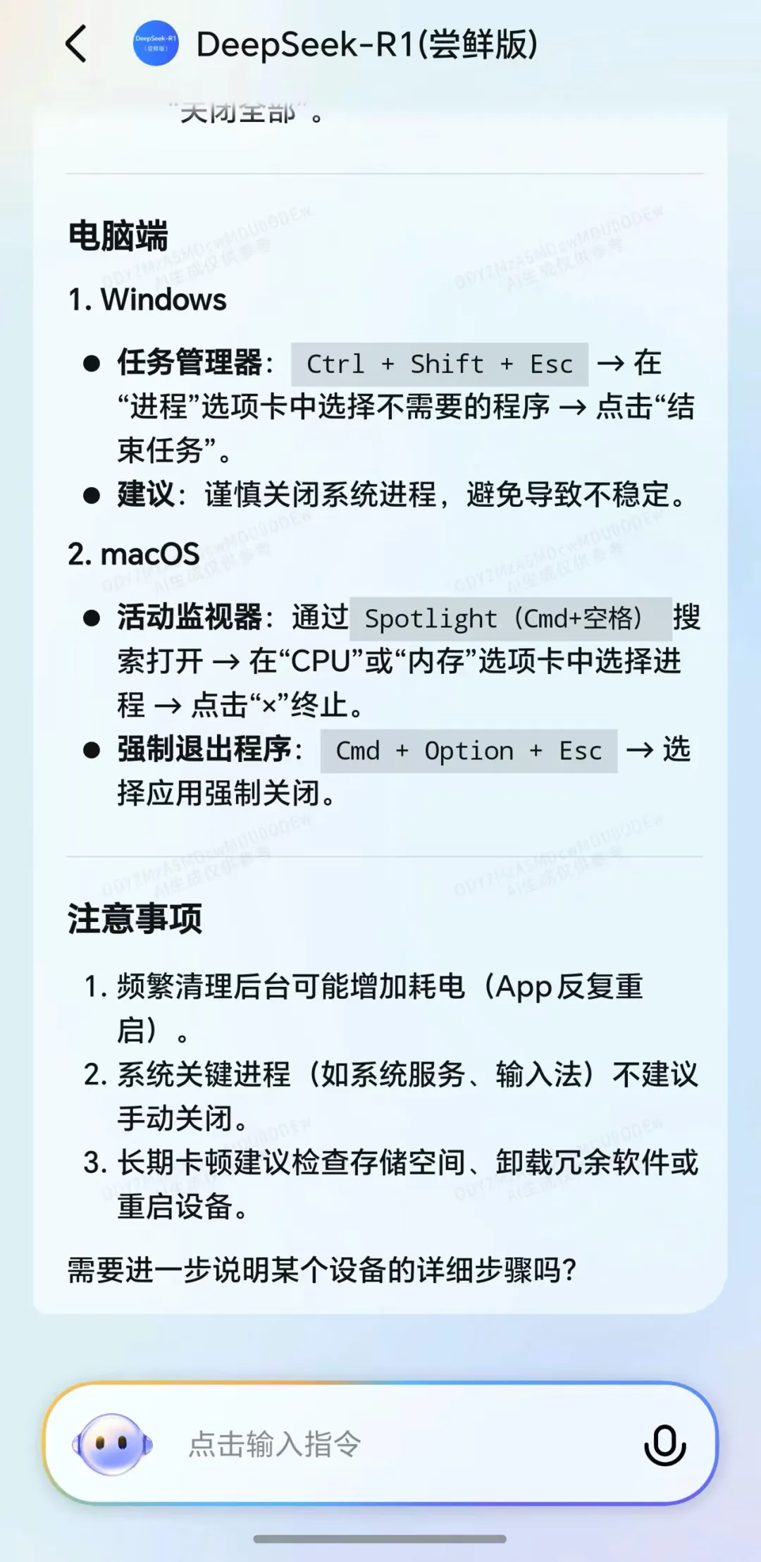 以荣耀Magic7 Pro为例,剁椒Spicy在YOYO助理上调出DeepSeek-R1,然后让其“关闭后台”,结果其仅查阅网络上的资料,回复了不同设备关闭后台的方法。