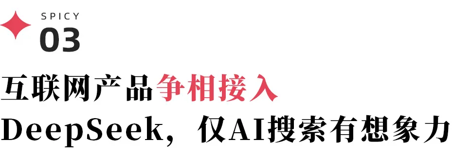 据剁椒Spicy不完全统计,2025年1月以来,中文互联网已有约100款产品部署DeepSeek模型。无论是云服务平台、互联网软件,还是智能汽车、智能手机等硬件产品,都参与到了这场“DeepSeek化”的狂欢中。