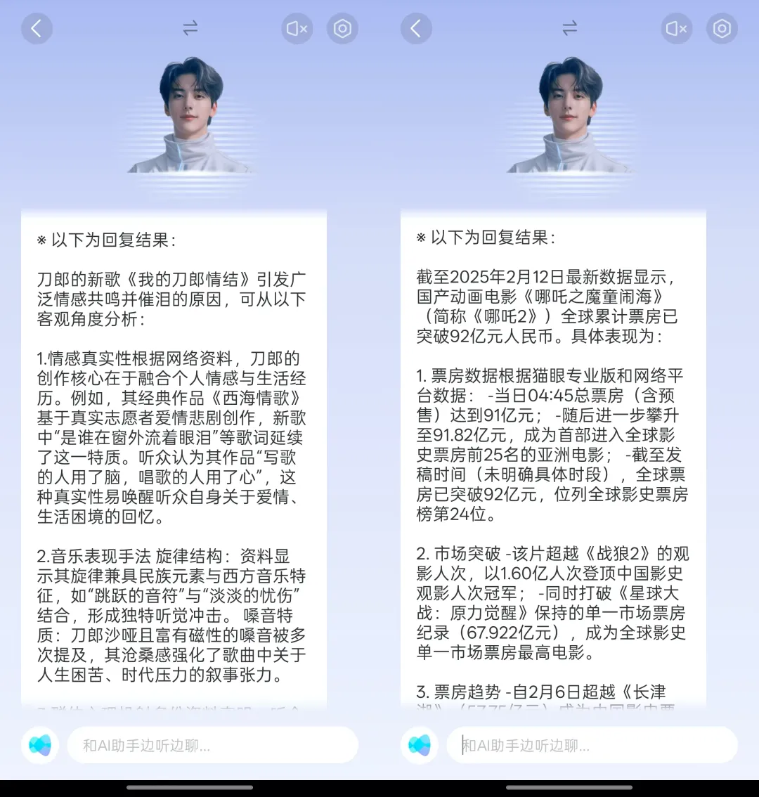 剁椒Spicy询问“刀郎的新歌为何催泪?”QQ音乐中的AI助手就给出了详细的回复。不过当我们询问与音乐不相关的“今天哪吒2的票房”问题时,QQ音乐中的AI助手依然可以给出准确的回复。