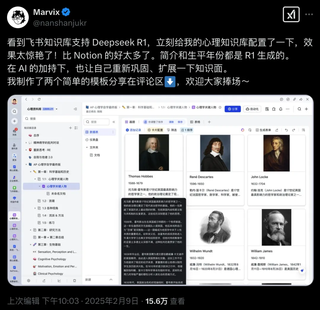 Repenser Élucider创始人Marvix就在社交媒体平台高度评价飞书的多维表格AI字段捷径,“给自己的心理知识库配置了一下,效果太惊艳了!比Notion的好太多了。简介和生平年份都是R1生成的。”