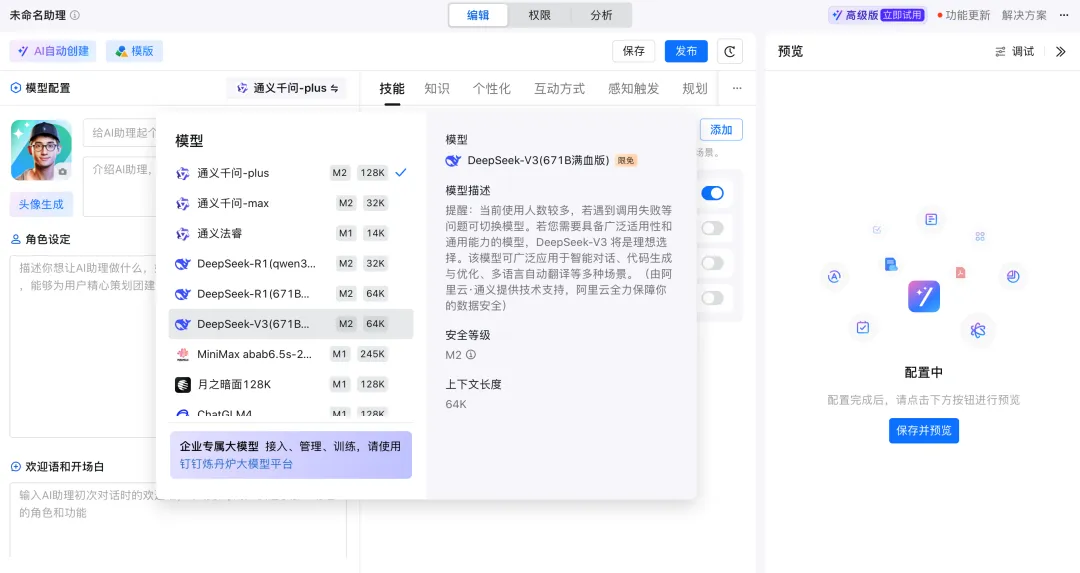 在钉钉中,如果想要使用DeepSeek,需要自己创建一个新的AI助理,然后在模型配置中选择DeepSeek-R1模型。具体使用的时候,DeepSeek在钉钉中主要以ChatBot的形式面向用户,支持深度推理和联网搜索,和DeepSeek官网提供的产品别无二致。