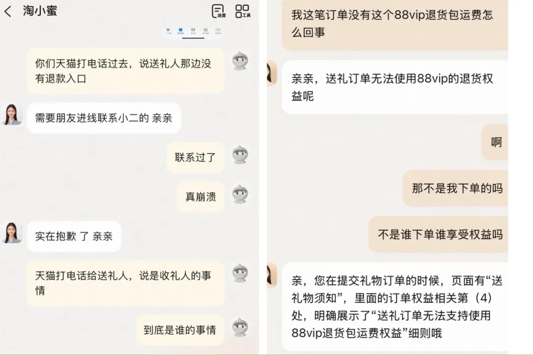 事实上,售后问题的确劝退了许多“第一批吃螃蟹”的消费者。金鑫称,“目前来看,只要是使用这个送礼功能,后期一旦发生售后问题,解决起来非常麻烦,感觉上线这个功能完全没经过对客服系统的培训。”